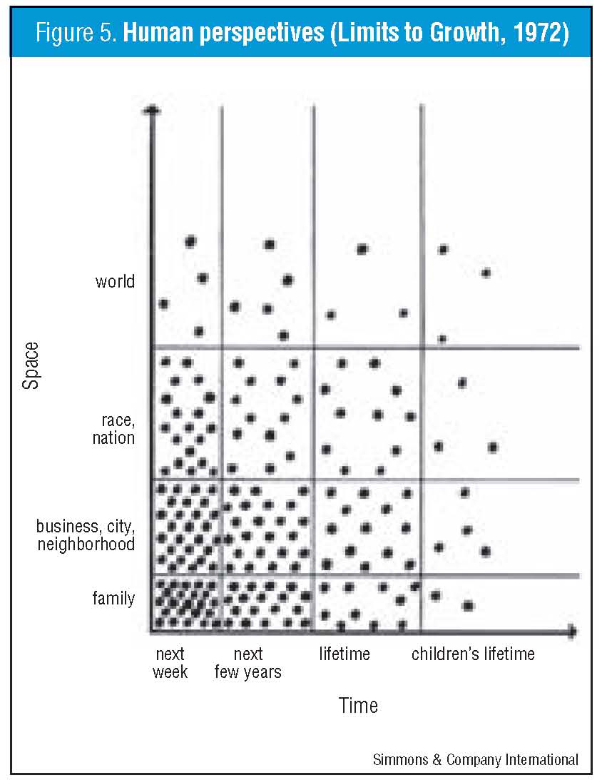 This classic figure plots human concerns across time and space, moving from more immediate to distant times and spaces. It locates the majority of people's concerns in the here and now, and as such it passes a rather bleak verdict on the public's capacity for sustainability (i.e. its ability to take into consideration the consequences of present activities that are distant in time and space).